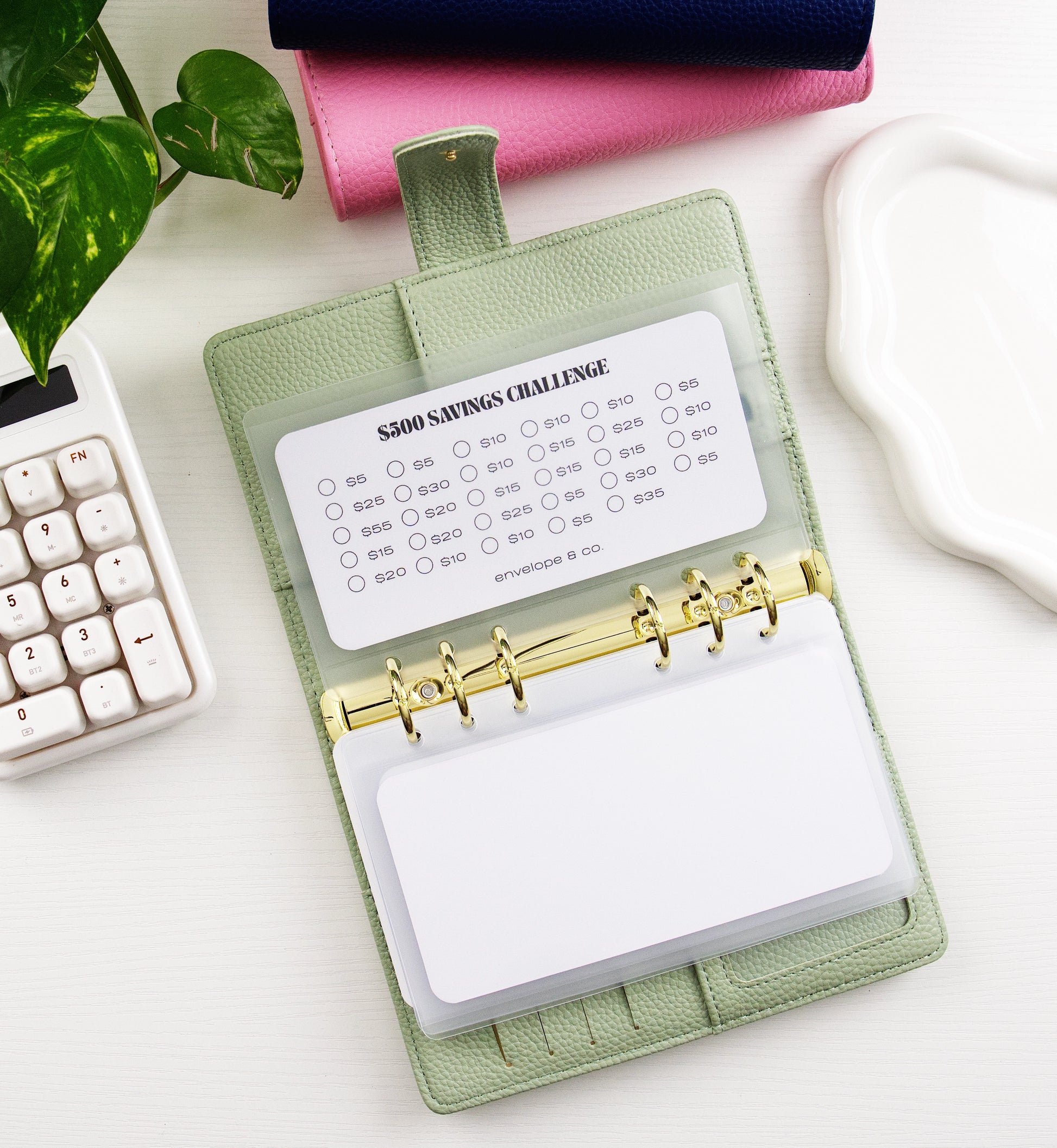 Start your cash management journey with our Minimalist Essentials Binder Bundle. This complete system includes a premium vegan leather A6 binder in your choice of Sage Green, Navy, or Pink, one 2026 minimalist dashboard, 6 envelope inserts with your choice of Cursive or Minimalist style label, a $500 savings challenge to kickstart your goals and 7 envelopes.