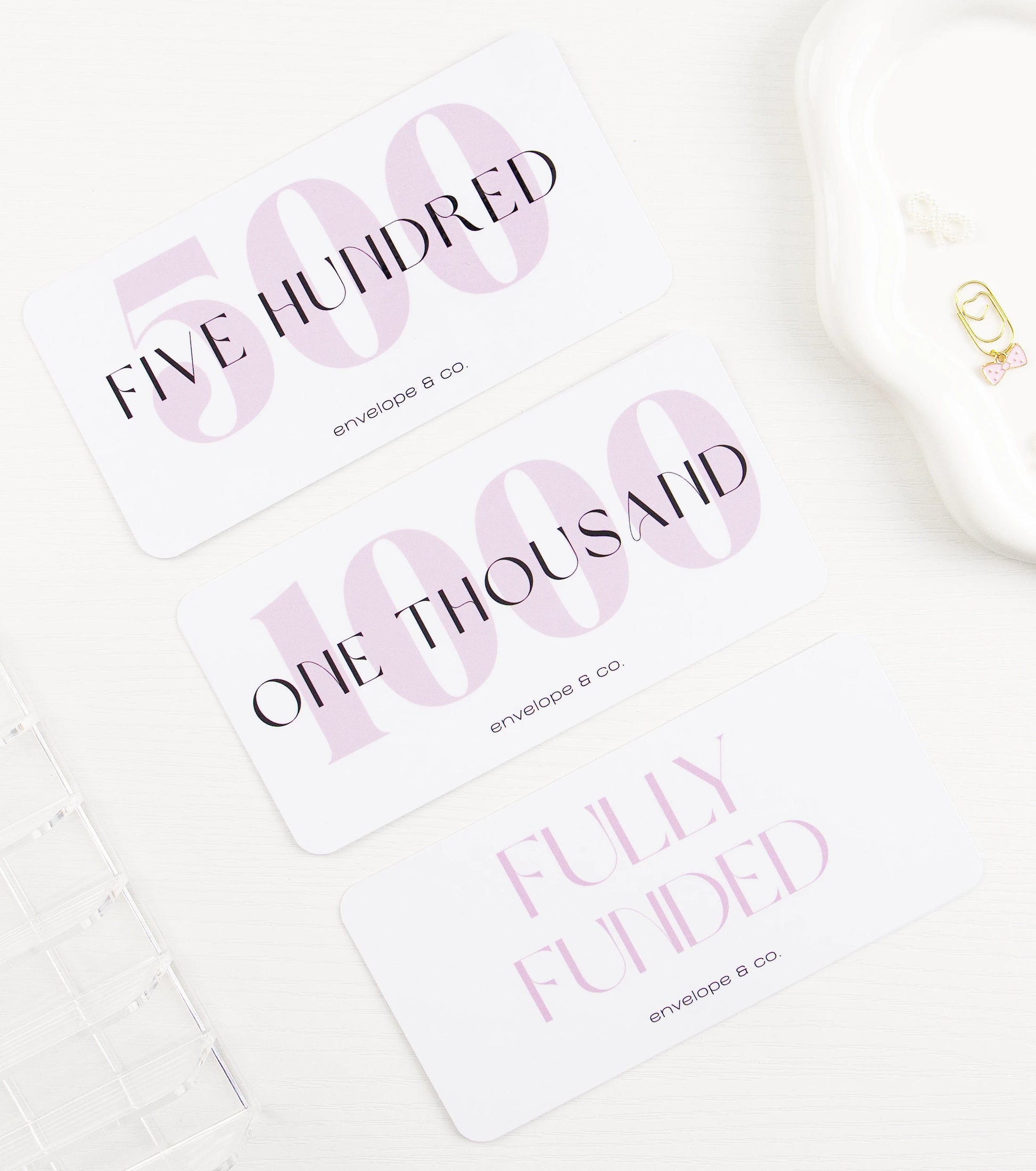 Keep perfect track of your cash management system with our minimalist placeholder envelope insert bundle. Designed for when your envelope holds more than it can physically contain, these placeholders maintain clarity while you deposit excess cash. Each bundle includes three pre-marked inserts—$500, $1,000, and Fully Funded—to instantly show how much has been moved to your bank account.